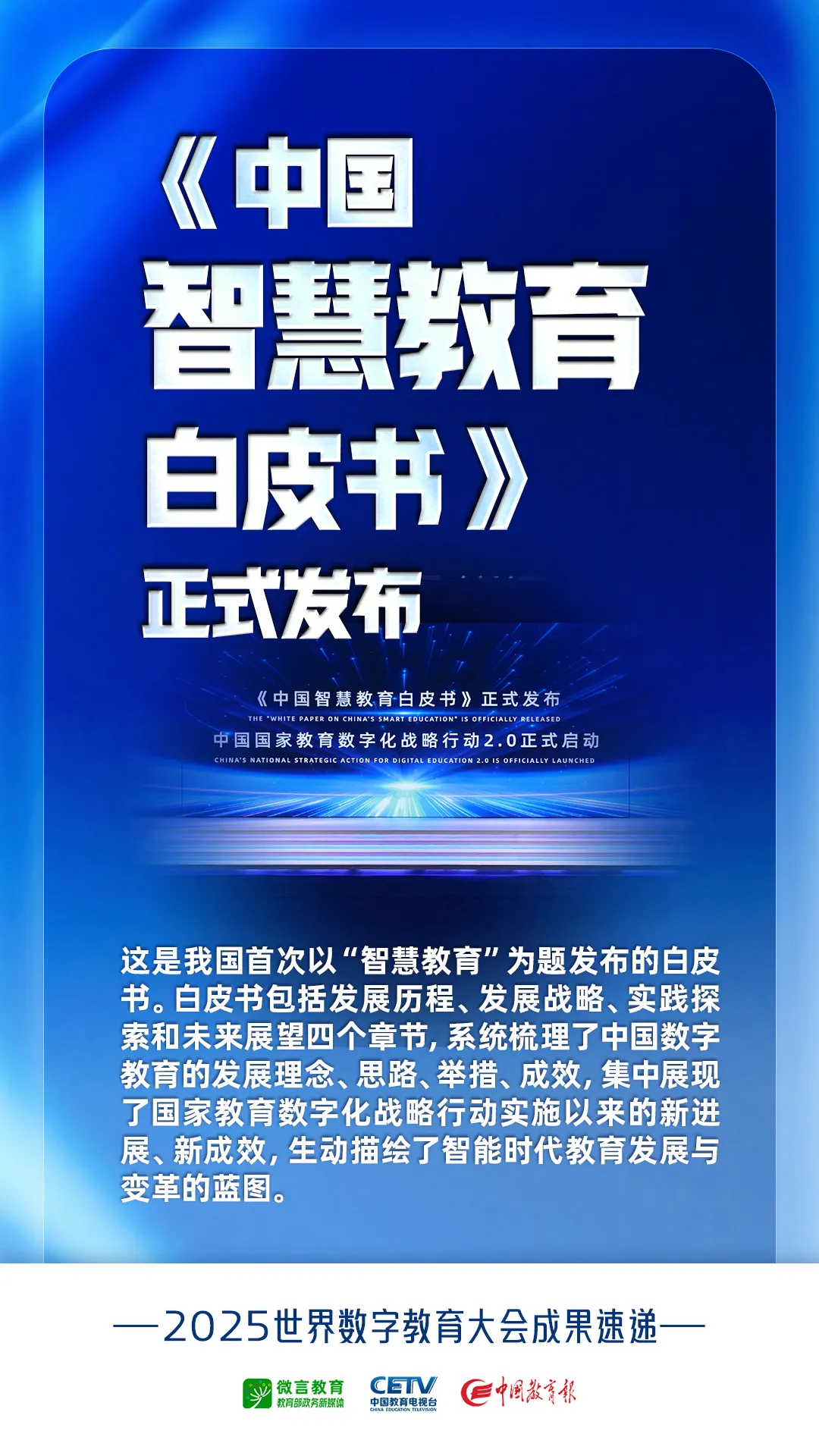 5月16日,《中国智慧教育白皮书》在2025世界数字教育大会上正式发布。这是我国首次以“智慧教育”为题发布的白皮书。白皮书包括发展历程、发展战略、实践探索和未来展望四个章节,系统梳理了中国数字教育的发展理念、思路、举措、成效,集中展现了国家教育数字化战略行动实施以来的新进展、新成效,生动描绘了智能时代教育发展与变革的蓝图。