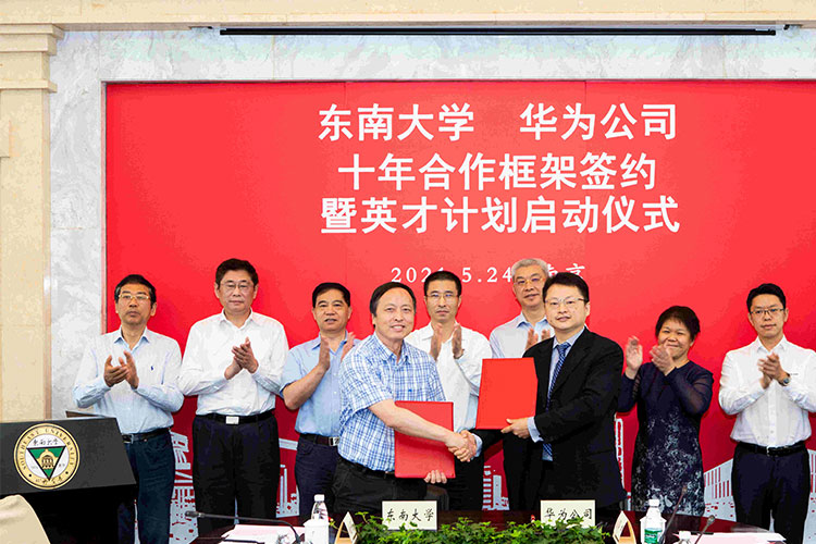 5月24日上午,东南大学-华为十年合作框架签约暨英才计划启动仪式在东南大学四牌楼校区举行。这是继2020年华为公司ceo任正非来访东南大学之后,双方在战略层面进行的重要合作。华为公司董事、战略研究院院长徐文伟,华为人力资源副总裁曾凡丽、华为全球技术合作副总裁艾超、上海海思总裁熊伟、华为南京研究所所长郭坤、华为海思技术规划部长王志敏、华为2012无线技术实验室执行主任卢建民;东南大学校长、中国工程院院士张广军,中国科学院院士崔铁军,东南大学常务副校长王保平,东南大学副校长丁辉、黄大卫、金保昇以及华为公司和东南大学相关部门、学院负责人出席仪式,签约仪式由丁辉主持。
