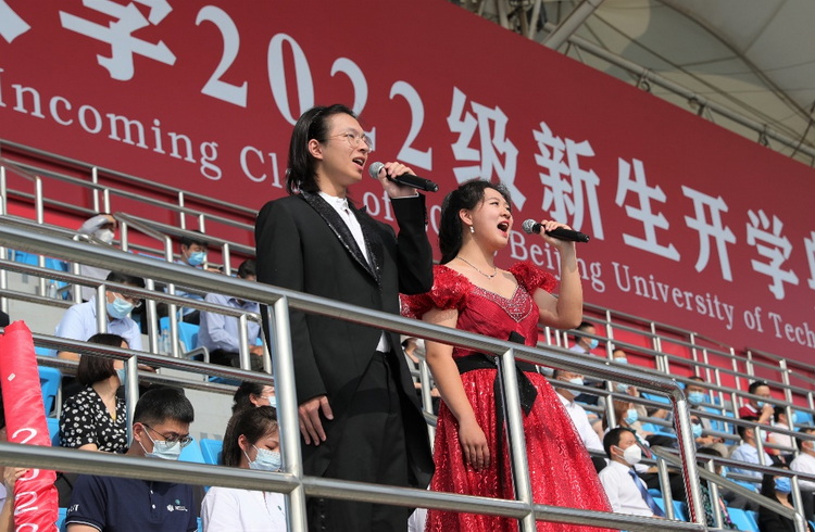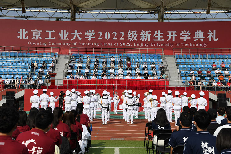 开学典礼在学生行进管乐团演奏的《钢铁洪流进行曲》《歌唱祖国》以及学生合唱团演唱的校歌《明天》中拉开序幕。迎着灿烂的朝阳,注视着飘扬的国旗,全体2022级新生高唱国歌,开启了一段与北京工业大学的双向奔赴。