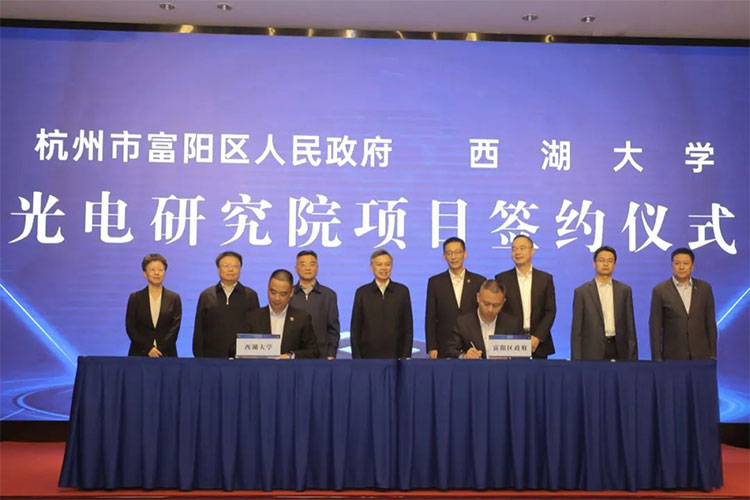 10月25日,富春江畔,西湖大学与杭州市富阳区人民政府签订战略合作协议,共建西湖大学光电研究院。西湖大学校长施一公与富阳区委书记吴玉凤共同为研究院揭牌。
