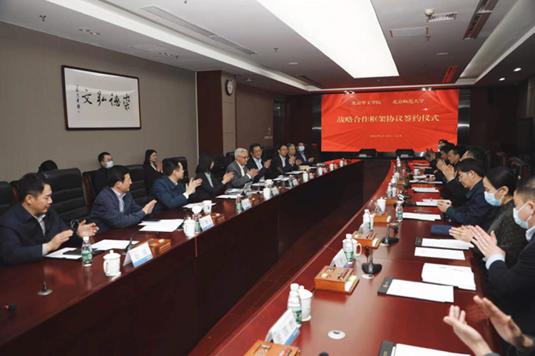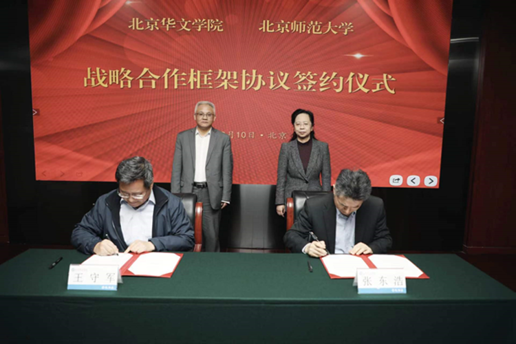 3月10日下午,北京师范大学与北京华文学院战略合作协议签约仪式在北京华文学院举行。北京师范大学校长马骏、副校长王守军,北京华文学院党委书记刘香玲、院长张东浩、副院长王雄义、党委副书记张鲁卿出席签约仪式。两校相关院系、部门负责人参加签约仪式。