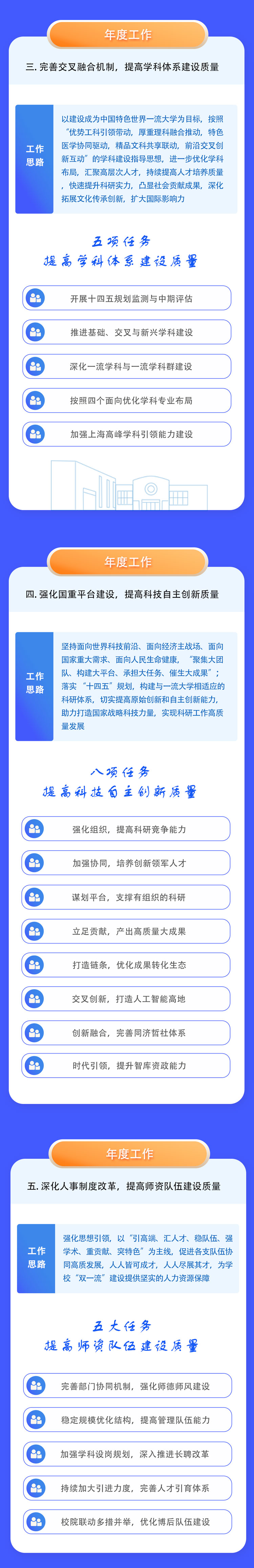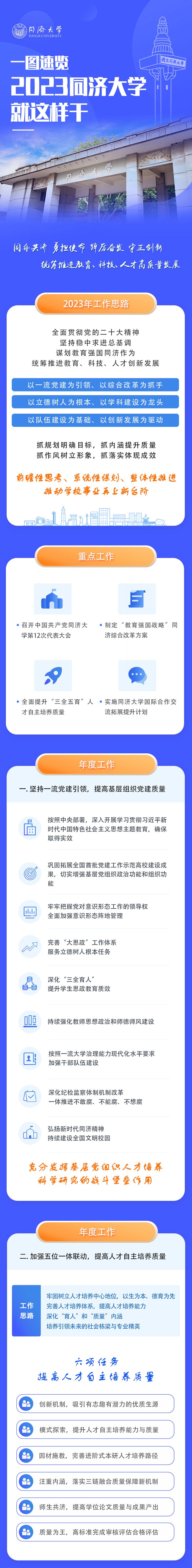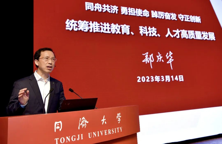 郑庆华从党的二十大对统筹推进教育科技人才强国作出的重要部署、信息技术对教育和思维的重要影响、区域发展新机遇和一流大学建设新要求等方面分析了当前学校面临的形势与挑战。他指出,我们要直面问题,巩固已经取得的优势,努力补齐短板,围绕学校中心工作进行系统谋划,主动作为、提质增效。2023年,学校将全面贯彻党的二十大精神,谋划教育强国同济作为,统筹推进教育、科技、人才创新发展,以一流党建为引领、以综合改革为抓手、以立德树人为根本、以学科建设为龙头、以队伍建设为基础、以创新发展为驱动,进行前瞻性思考、系统性谋划、整体性推进,推动学校事业再上新台阶。