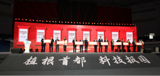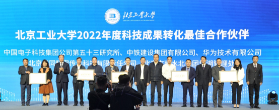 与会领导、嘉宾为获得“北京工业大学2022年度科技成果转化最佳kok手机登录入口的合作伙伴”的企业和学校团队代表颁奖,并共同启动了北京工业大学科技创新成果转化促进大会暨校园开放日系列活动。