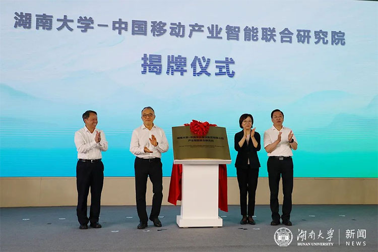湖南省人大常委会党组成员谢建辉,中国移动副总经理高同庆,长沙市委副书记、湖南湘江新区(长沙高新区)党工委书记、岳麓区委书记谭勇,湖南大学校长段献忠等现场见证签约并为湖南大学—中国移动产业智能联合研究院揭牌。