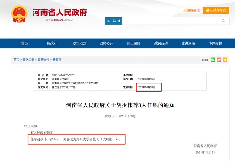 近日,河南省人民政府发布一批人事任免通知,决定任命胡少伟、徐东升、刘春太为郑州大学副校长(试用期一年)。