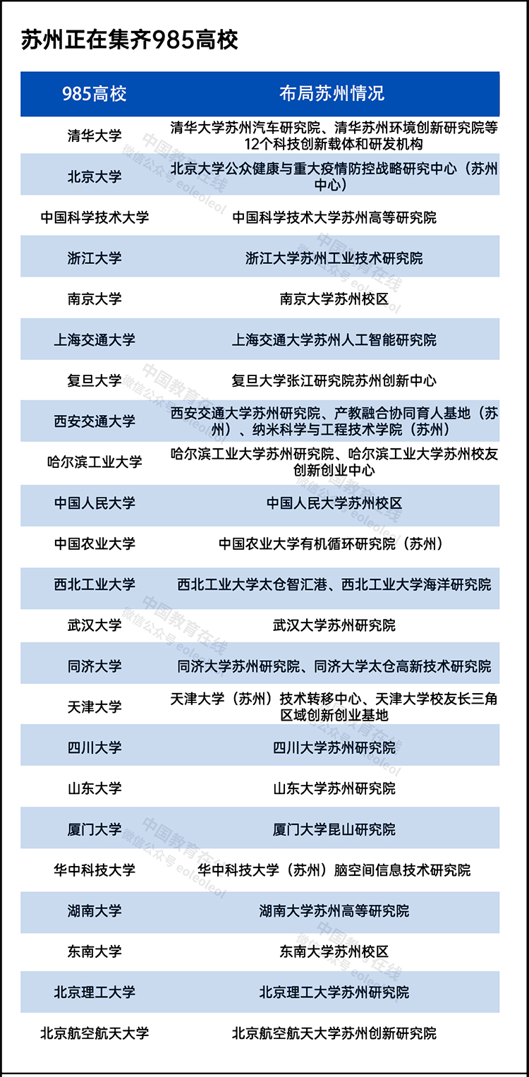 据了解,近年来,苏州广泛引进名校设立研究院或校区。其中包括清华大学、北京大学、中国科学技术大学、浙江大学、南京大学、复旦大学等多所985。