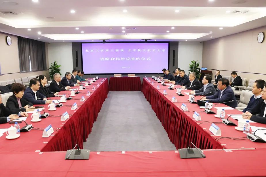 为积极探索医工交叉融合创新,服务人民生命健康,12月26日,北京大学第三医院与北京航空航天大学战略合作协议签约仪式在北航如心会议中心中报告厅举行。北医三院党委书记金昌晓、院长付卫、副院长沈宁、副院长唐熠达,北航党委书记赵长禄、校长王云鹏、党委副书记程波、副校长吕金虎出席会议。会议由王云鹏主持。