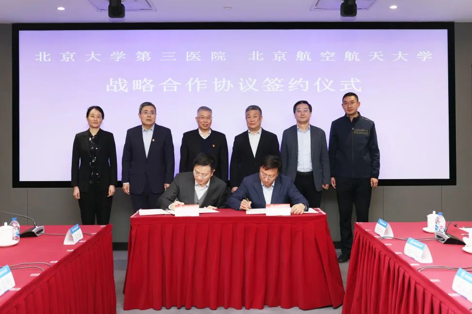 唐熠达、吕金虎分别代表北京大学第三医院、北京航空航天大学签署协议,金昌晓、付卫、沈宁,赵长禄、王云鹏、程波见证签约。