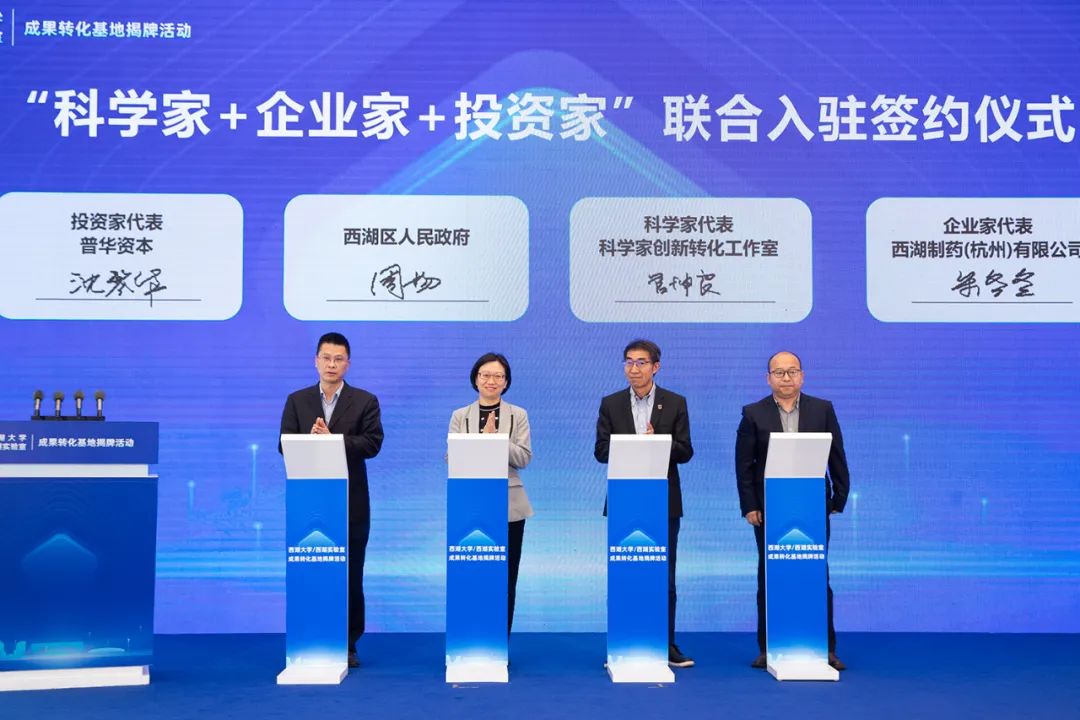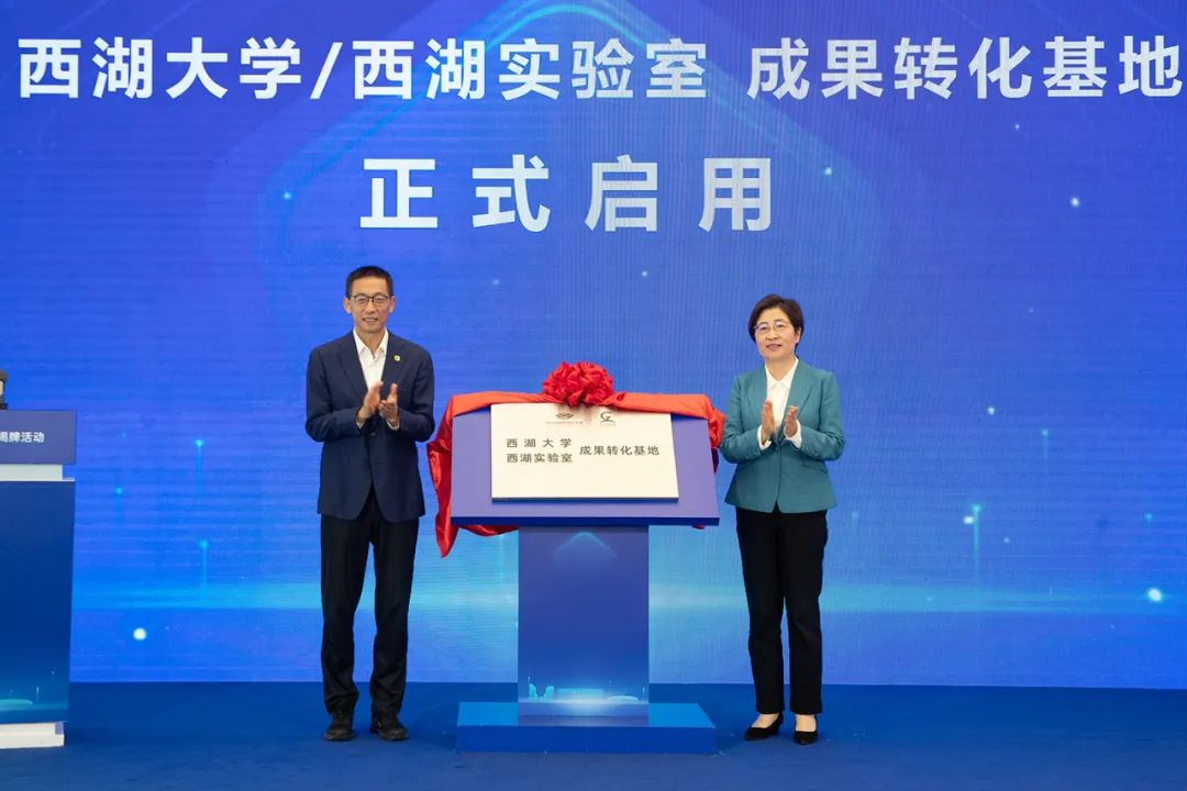 杭州市委常委、常务副市长、城西科创大走廊党工委书记陈瑾,中国科学院院士、西湖大学校长施一公共同为西湖大学/西湖实验室成果转化基地揭牌。