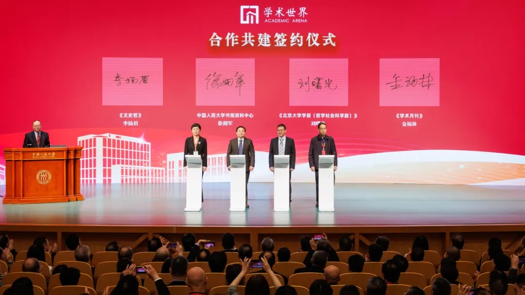 目前,首批上百家期刊签署了加入“中国特色哲学社会科学自主知识体系数字创新平台——学术世界”合作协议。发布会上,《北京大学学报(哲学社会科学版)》代表刘曙光,《文史哲》代表李扬眉,《学术月刊》代表金福林与“学术世界”代表、中国人民大学书报资料中心主任徐拥军进行签约。