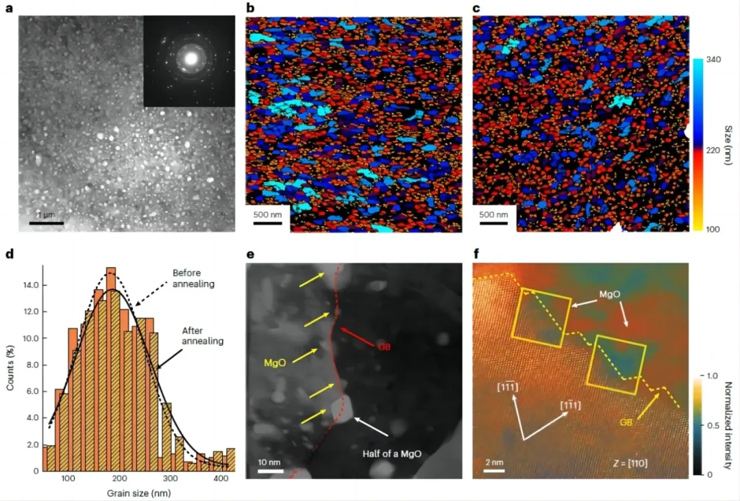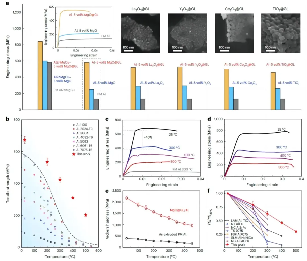 为此,何春年团队通过在铝合金中引入高含量、超细尺寸、均匀分散的纳米氧化物颗粒,成功提升了铝合金的耐高温性能。在研究中,该团队提出了全新的制备思路,解决了困扰已久的纳米颗粒的分散难题,将理论上最理想的材料转化为现实。最终,研制的新型铝合金在500℃的拉伸强度(200兆帕)相比传统铝合金提高了6倍以上,高温稳定性提高了几个数量级。