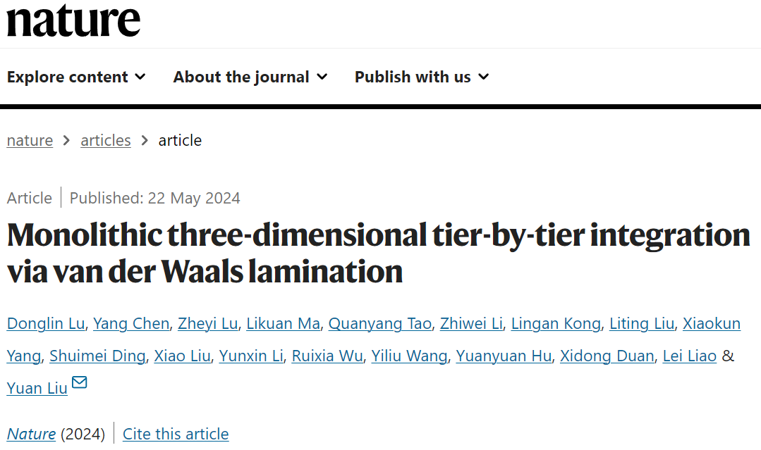 5月22日,该研究成果以“monolithic three-dimensional tier-by-tier integration via van der waals lamination”为题在线发表在《自然》杂志上,湖南大学为独立完成单位,作者分别来自物电院、化工院、半导体学院。物电院陆冬林博士为第一作者,物电院刘渊教授为唯一通讯作者。该工作得到了来自国家自然科学基金、国家重点研发计划等项目的资助。