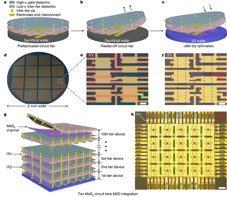 三维集成是通过在垂直方向上将多个独立的芯片或功能层堆叠在一起的器件系统,能够实现逻辑、存储和传感等功能的垂直集成和协同工作,是后摩尔时代的重要技术路线。目前商用的三维集成主要是通过封装技术将多芯片或者多芯粒垂直堆叠和互联。单芯片三维集成则是直接在同一芯片内部垂直集成多个器件层。通过将每一器件层直接制备在另一器件层之上,能够进一步提高芯片的互联密度和性能。然而,硅基单芯片三维集成面临着严重的热预算问题,其上层的硅沟道制备工艺会导致下层硅器件掺杂扩散和性能退化,限制了三维集成的发展。