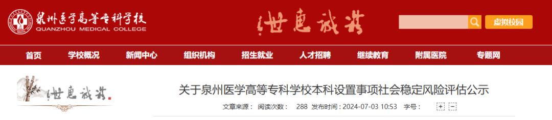 7月3日,泉州医学高等专科学校kok登录官网发布《关于泉州医学高等专科学校本科设置事项社会稳定风险评估公示》。