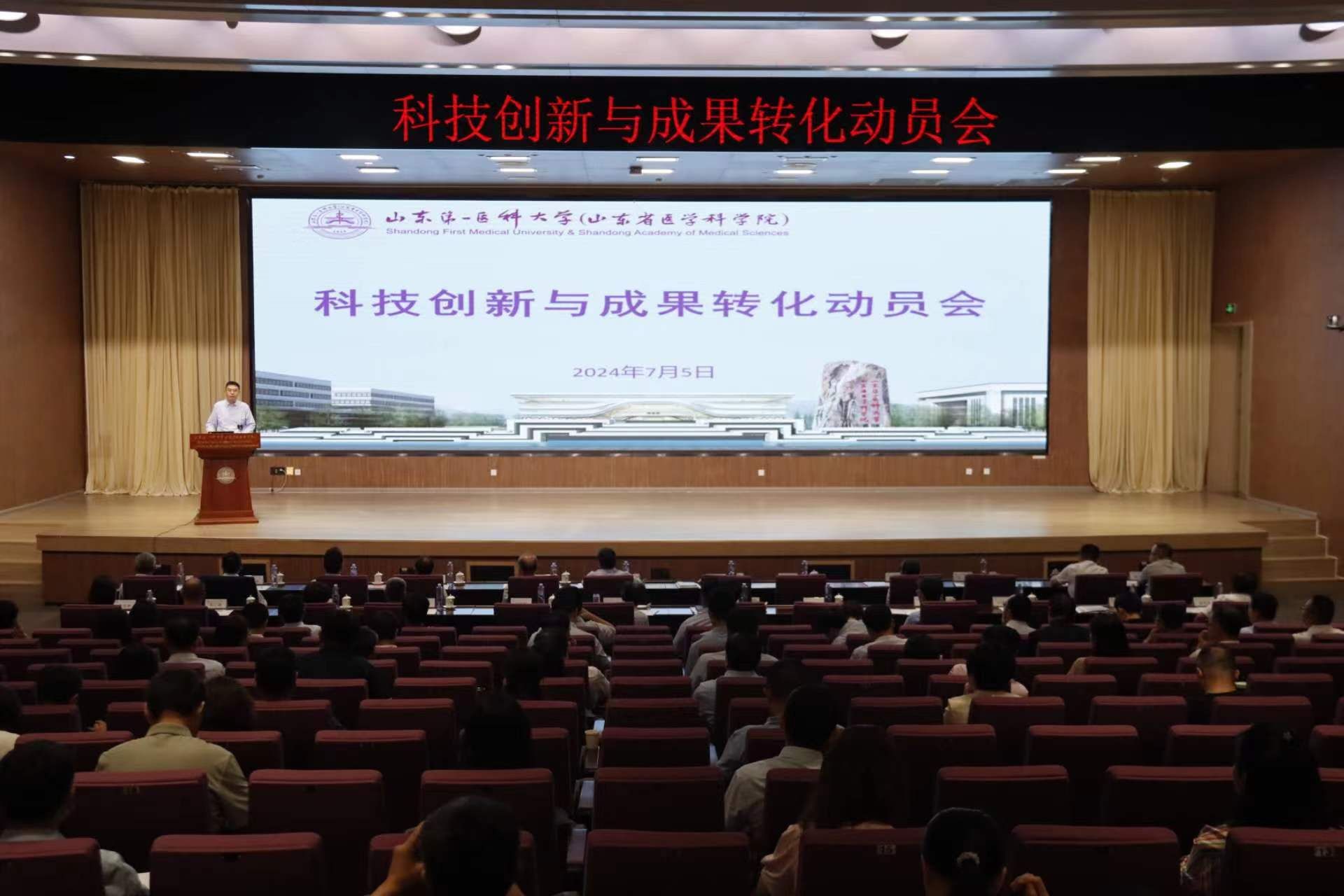 刘思金在讲话中指出,召开科技创新与成果转化动员会,旨在深入学习贯彻习近平总书记视察山东重要讲话重要指示精神和关于科技创新的重要论述,紧紧围绕应用研究型一流大学创建目标,聚焦服务发展新质生产力,着力打造具有山东第一医科大学鲜明特色的科技成果转移转化体系,更好服务新旧动能转换和医养健康产业发展。他强调,加快科技成果转移转化是高校服务国家创新驱动发展的重要使命,是教育科技人才一体化推进的关键举措,也是推动山一大高质量发展的迫切需要。