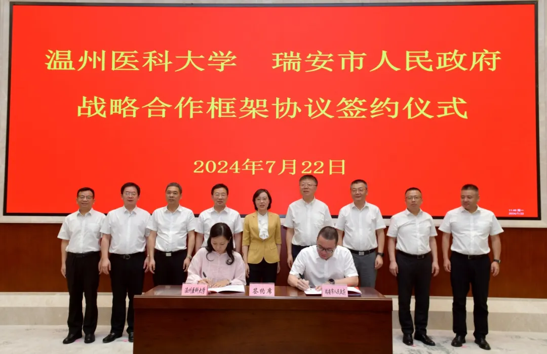 7月22日上午,温州医科大学·瑞安市人民政府战略合作框架协议签约仪式举行。双方代表签署《战略合作框架协议》,并围绕校地合作展开座谈交流。