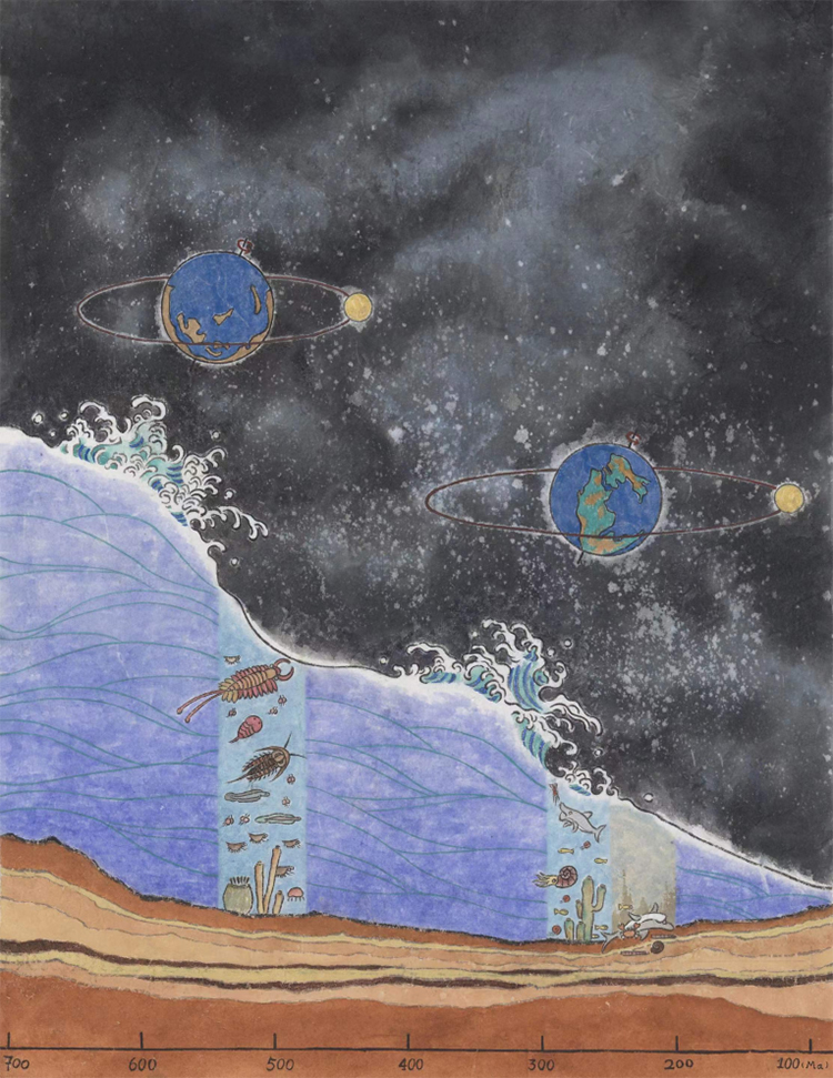 ▲团队联合四川省诗书画院罗婧文画家共同创作的中国画展示了地球阶梯式自转减速影响的潮汐和地球系统的演化
