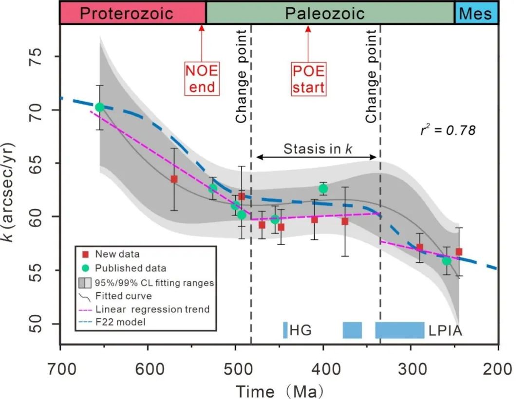 这些结果能够独立验证潮汐模型的可靠性,并揭示7亿至2亿年前地球自转减速的阶梯模式。在这个时期,地月距离增加了约20000公里(每百年增加约4米),日长增加了约2.2小时(每百年增加约1.58毫秒)。