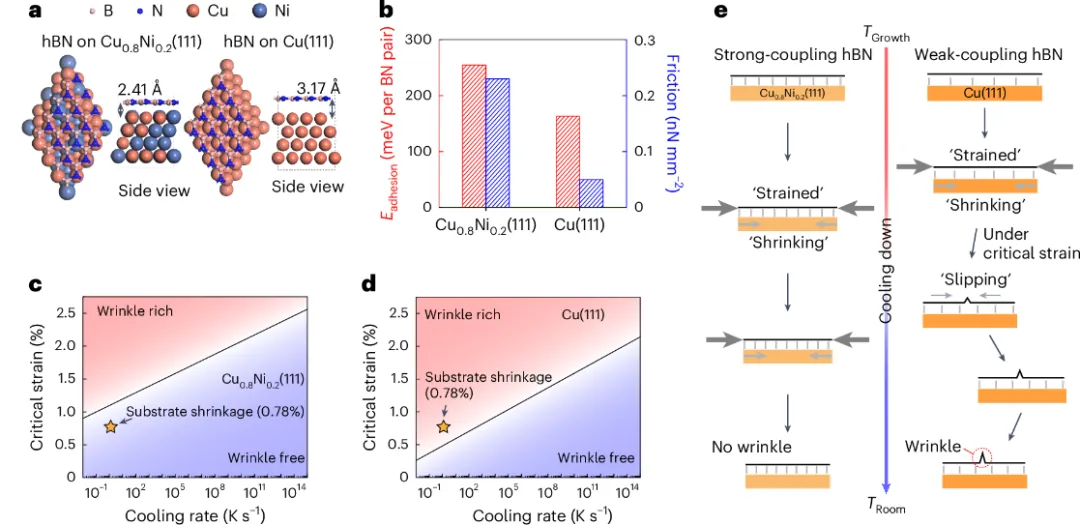 图2. 在cu0.8ni0.2(111)衬底上氮化硼的褶皱抑制机制。(a)单层氮化硼分别在cu0.8ni0.2(111)衬底(左)和cu(111)衬底(右)上的原子模型;(b)氮化硼分别与cu0.8ni0.2(111)和cu(111)的结合能(红色)和摩擦力(蓝色);(c-d)在cu0.8ni0.2(111)衬底(c)和cu(111)衬底(d)上的计算得到的褶皱形成的临界应力随冷却速率的变化;(e)降温过程中在cu0.8ni0.2(111)衬底上氮化硼褶皱被抑制(左)和在cu(111)衬底上氮化硼褶皱产生(右)的示意图。