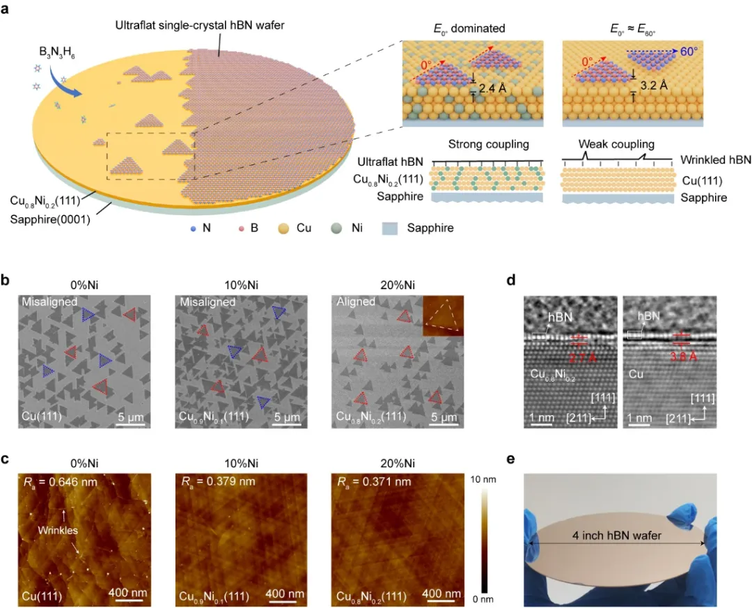 近日,深圳理工大学讲席教授丁峰与北京大学教授彭海琳合作,以ultraflat single-crystal hexagonal boron nitride for wafer-scale integration of a 2d-compatible high-κ metal gate为题,在nature materials上发文。针对超平整氮化硼单晶晶圆的可控制备难题,丁峰教授团队从理论角度提出了一种新的策略-增强界面耦合作用(包括结合能与摩擦力),确保氮化硼畴区的单一取向,同时抑制了褶皱的形成,与北京大学彭海琳教授团队在cuni0.2(111)/蓝宝石表面上成功实现了4英寸超平整单层氮化硼单晶晶圆的可控制备(如图1所示)。