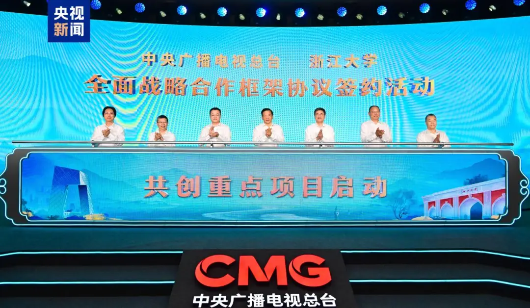8月19日,中央广播电视总台与浙江大学全面战略合作框架协议签约活动在京举行。中宣部副部长、中央广播电视总台台长慎海雄,浙江大学党委书记任少波,浙江大学校长杜江峰出席活动,并与中央广播电视总台编务会议成员薛继军、姜文波,浙江大学党委副书记朱世强,浙江大学党委常委、副校长黄先海共同启动总台与浙江大学共创重点项目。中央广播电视总台编务会议成员周振红出席活动。