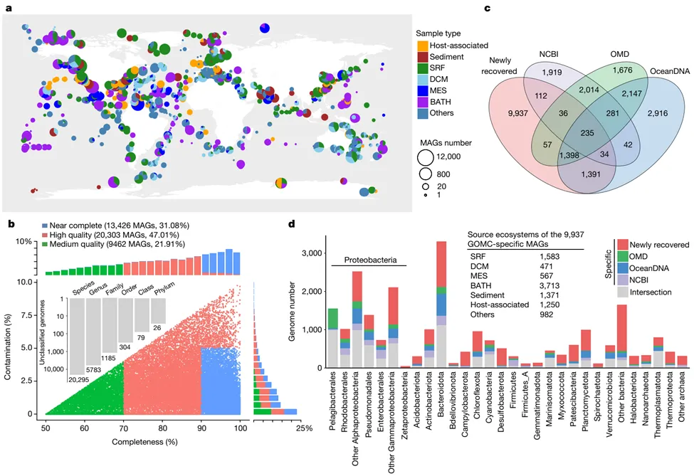 本研究构建了迄今为止最大、最完整的“全球海洋微生物组数据库”——the global ocean microbiome(gomc)。该数据库包含了24195个物种水平的非冗余基因组,其中近1万个基因组是本研究所特有的发现,主要来自于深海、沉积物、共附生等生境,极大拓宽了我们对海洋微生物多样性的理解,刷新了海洋原核微生物基因组大小的上限,揭示了缺氧海洋环境中大基因组细菌的适应性演化规律,解析了全球海洋微生物群落的生物地理分布,为理解微生物在不同海洋环境中的遗传连通性提供了新的视角。