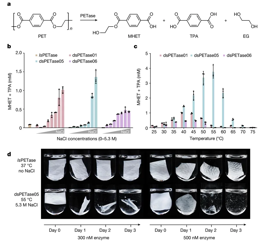 研究团队进一步构建了包含24.58亿非冗余基因序列的蛋白质数据库(gopc)。针对塑料废弃物对海洋环境造成的日益严峻的白色污染,利用gopc进行了pet塑料降解酶的定向挖掘,从深海热液喷口及深渊海沟的样品测序数据中筛选出3个嗜盐耐热pet水解酶,其催化活性随nacl浓度的升高而增加,比陆地微生物中发现的ispetase活性高12-44倍。活性最高的dspetase05可在3天内将pet膜大部分降解,降解率达到83%。这是国际上首次从深海中发现的高活性pet水解酶,不仅展示了gopc在生物勘探领域的应用潜力,也为pet塑料的生物降解与再生这一热点领域提供了全新的工具。