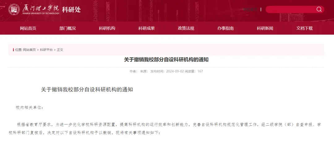 9月2日,厦门理工学院发布《关于撤销我校部分自设科研机构的通知》。