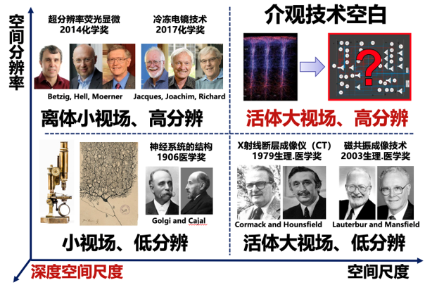 细胞是生命活动的基本单位。每时每刻,人体内都在上演着大量不同类型细胞间交互作用所形成的交响曲。然而,在这一连接微观与宏观之间的介观尺度上,却存在巨大的技术空白,使得当前研究难以在哺乳动物的活体环境器官尺度下同时观测大量细胞在不同生理与病理状态下的时空异质性,极大限制了脑科学、免疫学、肿瘤学、药学等学科发展。仅以脑科学为例,大量神经元间的相互连接和作用涌现出如智能、意识等功能,厘清神经环路的结构和活动规律是解析大脑工作原理的必由之路。然而具备单神经元识别能力的传统显微镜往往只具备毫米级视场,仅能覆盖小鼠单个或几个脑区实现单个平面的神经信号动态记录;功能核磁虽然能够实现三维全脑范围观测,但空间分辨率却远不足以识别单细胞。因此,2013年启动的美国脑计划也将“大规模神经网络记录技术”列为九大资助领域之一。同样,对于肿瘤学而言,只有兼具大视场与高分辨才能全景式捕捉肿瘤发生发展的完整过程,从而更精准地研究不同药物反应,发现新的药物靶点。