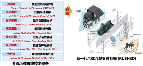 瞄准这一国际前沿难题,清华大学戴琼海院士团队早在2013年就获得了国家自然科学基金委重大科研仪器研制项目支持,在国际上率先开展了介观活体显微成像领域研究,并于2018年成功研制了国际首台亿像素介观荧光显微仪器rush,能够同时兼具厘米级视场与亚细胞分辨率。尽管这一系统被国际同行誉为介观显微成像领域的先驱,但是由于仪器复杂昂贵,在当时仅能被少数科学家使用。与此同时,rush系统仍然面临一系列瓶颈,包括:如何利用二维传感器实现高速三维成像;如何避免激光长时间照射所引起的细胞损伤(即光毒性)从而实现长时程高速观测;如何克服复杂成像环境导致的光学像差与背景干扰;如何提升弱光条件下的成像信噪比;如何高效处理大规模介观数据等等。每一项技术瓶颈本身都是生物医学成像领域的国际难题,而如何在同一系统上同时解决这些活体成像壁垒,则变得更为挑战。