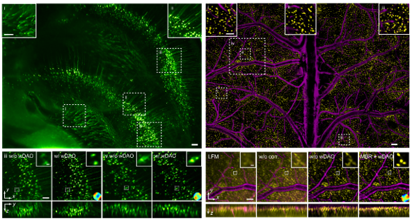 计算成像是改变了传统光学成像“所见即所得”的设计理念。利用计算编码、计算采集等多维尺度计算架构,实现对高维光场的超精细感知与融合,为机器设计更好的感知系统,从而突破传统光学成像的一系列物理瓶颈。然而这条创新之路同样充满荆棘,rush3d系统集成了团队过去十多年来一系列的理论和关键技术创新,才真正实现了整体性能的颠覆性提升。针对二维传感器难以捕捉三维动态变化的难题,团队提出了扫描光场成像原理,能够在实现轴向400微米范围的高速三维成像的同时,将激光照射对细胞的损伤降低了数百倍。针对活体组织复杂环境引起的光学像差降低系统成像分辨率与信噪比这一难题,团队提出了基于波动光学的数字自适应光学架构,无需在光学系统中增加额外波前传感器或者空间调制器,在后端即可完成大视场多区域自适应光学像差矫正,从而提升大视场复杂环境三维成像的空间分辨率以及信噪比。这一设计使得仅需常规尺寸物镜,就能有效克服空间非一致的系统像差和样本像差难题,实现了全视场内均一高空间分辨率的十亿像素成像,显著降低介观成像系统尺寸与成本,使得高分辨活体介观显微成像系统变得更加广泛可及。除此之外,活体荧光成像中背景荧光严重影响了成像信背比,rush3d采用多尺度去背景算法实现背景信号和在焦信号的分离,精准滤除散焦背景,从而提升成像信背比,恢复淹没在荧光背景中的荧光信号。进一步与共聚焦扫描光场融合,将能在具备高通量介观观测能力的同时,实现共聚焦成像保真度。