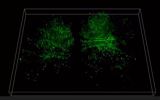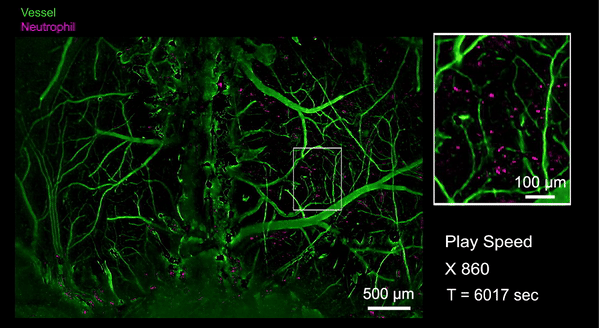 跨时空的多尺度成像能力使得rush3d极大提升了实验效率。例如,药物筛选实验能够在单次实验中显著提高效率,免去多次试验需求。同时,由于rush3d可以提供足够数据进行统计分析,跨个体差异可以在一次实验中得到有效缓解。此外,诸如肿瘤转移等稀有事件,在rush3d的观察中将不再是偶发事件,而是常规可见现象,成百上千倍地提升了活体生物发现的效率。凭借其低光毒性三维观测的优势,该系统还能够同时观察到细胞间的长距离通信,并通过长时间追踪数百万个细胞,揭示集体细胞行为的物理规律和功能涌现的机制,例如能够捕捉从肿瘤发生开始到免疫应答、肿瘤生长的全过程,揭示肿瘤产生的完整免疫活化反应。作为rush3d在医学领域的初探,研究人员首次观测到了急性脑损伤(脑震荡等)后整个大脑皮层范围内的中性粒细胞迁移活动。当小鼠的脑部受到撞击以后,大量的中心粒细胞从血管周边非血管区域流出进入脑实质,也有极罕见的细胞从脑实质回流到血管里,这意味着有些细胞可能通过类淋巴系统进入脑实质,并且会流回血管中将信息传递到生物体的其他地方。通过国际首次捕捉对脑损伤修复过程单细胞水平的免疫反应,有助于开发特定疗法避免急性脑损伤后组织水肿带来的脑功能缺失难题,并为更广泛的脑疾病等医学问题提供新视角。