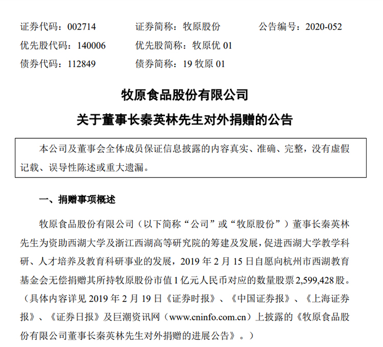 2020年4月份,牧原股份公告称,其董事长秦英林拟自愿向杭州市西湖教育基金会再次无偿捐赠其所持牧原股份市值8亿元人民币对应数量的股票。