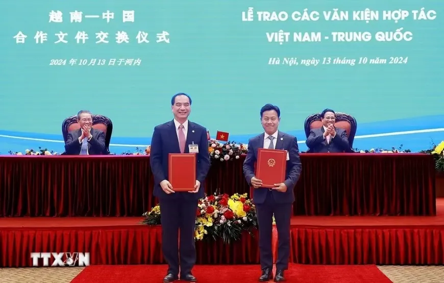 10月13日,在两国领导人共同见证下,北京大学校长龚旗煌与越南河内国家大学校长黎君交换《北京大学-越南河内国家大学谅解备忘录》。