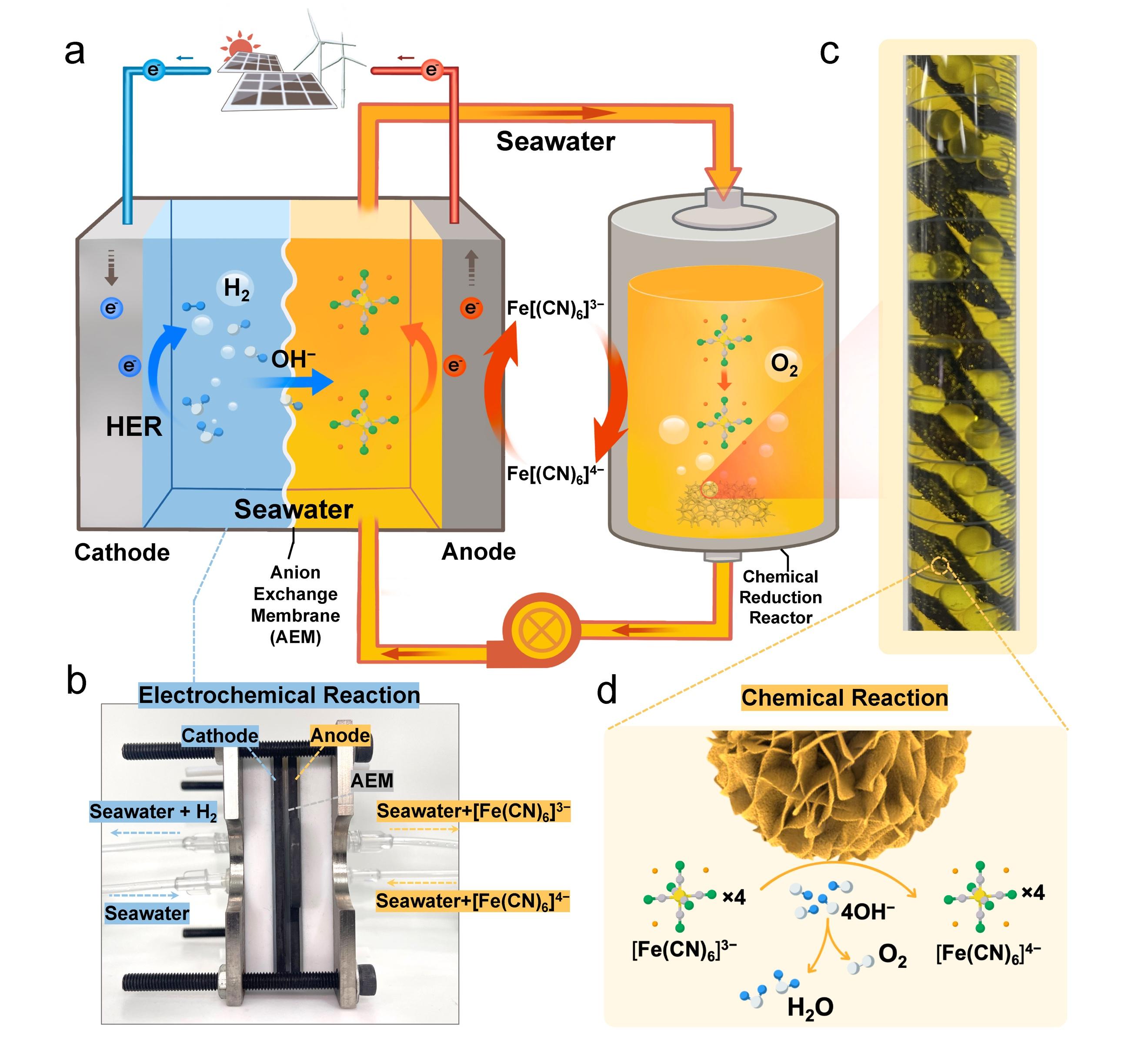 不同于2022年11月谢和平院士团队nature正刊上提出的相变迁移海水直接电解制氢颠覆性原理技术,该研究是谢和平院士团队围绕海水中的氯离子引发副反应和电极腐蚀现象,提出的另一种新的解耦式海水直接电解制氢策略。论文系统研究了铁氰酸根/亚铁氰酸根电对([fe(cn)6]3−/4−)在真实海水体系下可逆氧化还原特性,探明了电解系统阴极析氢反应与阳极亚铁氰酸根氧化反应的高效性,厘清了解耦体系下氧气自发稳定产出的反应机理,实现了全新系统在真实海水环境下250小时的长时间稳定。该项原理技术巧妙规避了海水中氯离子对电解制氢反应的干扰,充分验证了解耦式海水直接电解制氢系统在复杂海水环境下的抗腐蚀性与对氯离子副反应的应用潜力,将有助于丰富和进一步构建破解海水复杂成分影响的海水电解制氢理论体系和技术框架。