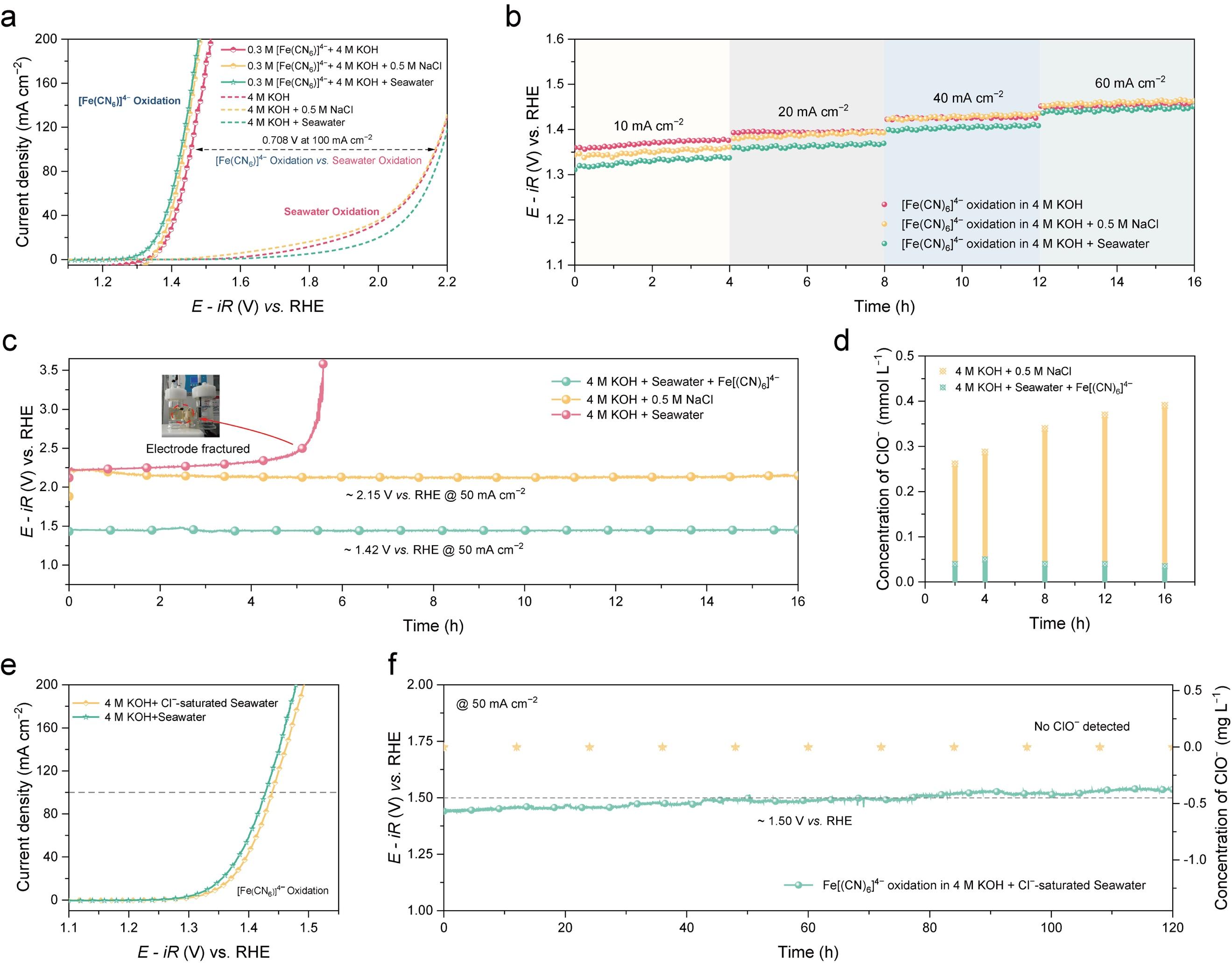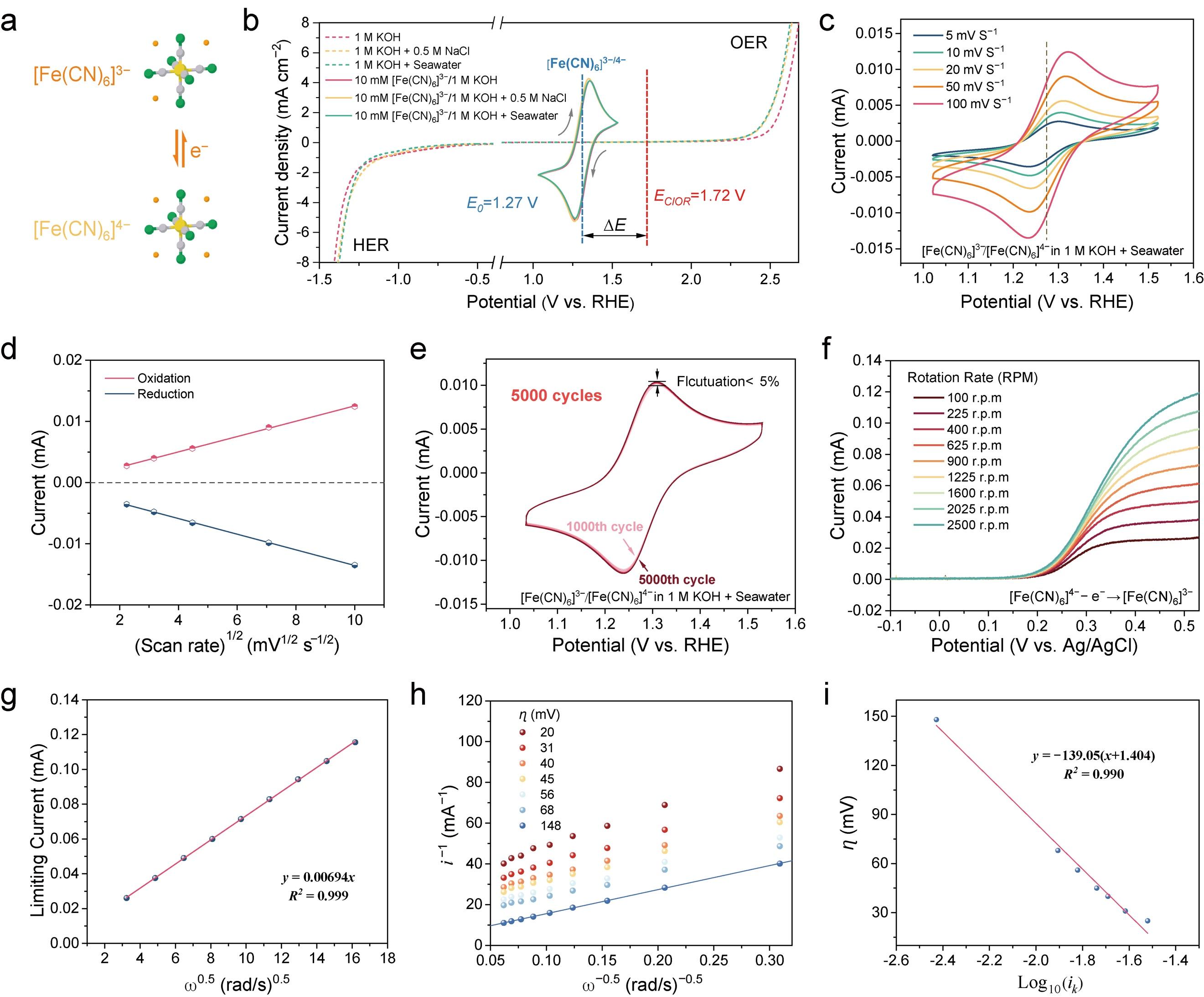 该研究针对海水制氢中最棘手的氯离子干扰难题,引入氧化还原介导的解耦策略,利用兼具热力学和动力学优势的阳极反应,巧妙规避了传统电解水制氢过程中析氧反应与氯离子反应的直接竞争,大幅降低了电化学腐蚀。在该研究中,[fe(cn)6]3−/4−电对在在海水中不仅保持了优异的可逆氧化还原动力学特性,而且在200 ma cm−2的接近工业级电流密度下实现了超过250小时的长时间稳定运行。