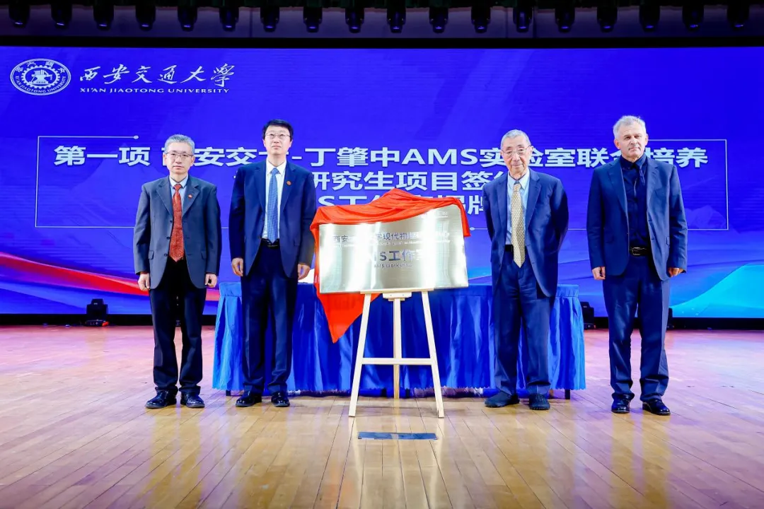 此外,丁肇中与张立群共同签署了西安交大-丁肇中ams实验室联合培养博士研究生项目合作协议。丁肇中、张立群、维塔利、西安交通大学物理学院院长高宏共同为西安交通大学现代物理研究中心ams工作室揭牌。