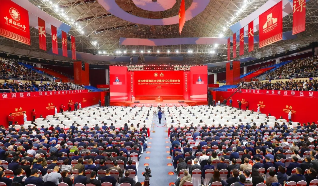 25日的中国海大校园,秋高气爽,阳光朗照,鲜花点缀,彩旗飘扬,处处洋溢着喜庆的节日氛围。上午10时,庆祝中国海洋大学建校100周年大会在崂山校区体育馆隆重举行。全校师生员工、海内外校友和关心中国海大发展的各界人士相聚线下线上,共襄盛举,共同见证中国海洋大学百年荣光。