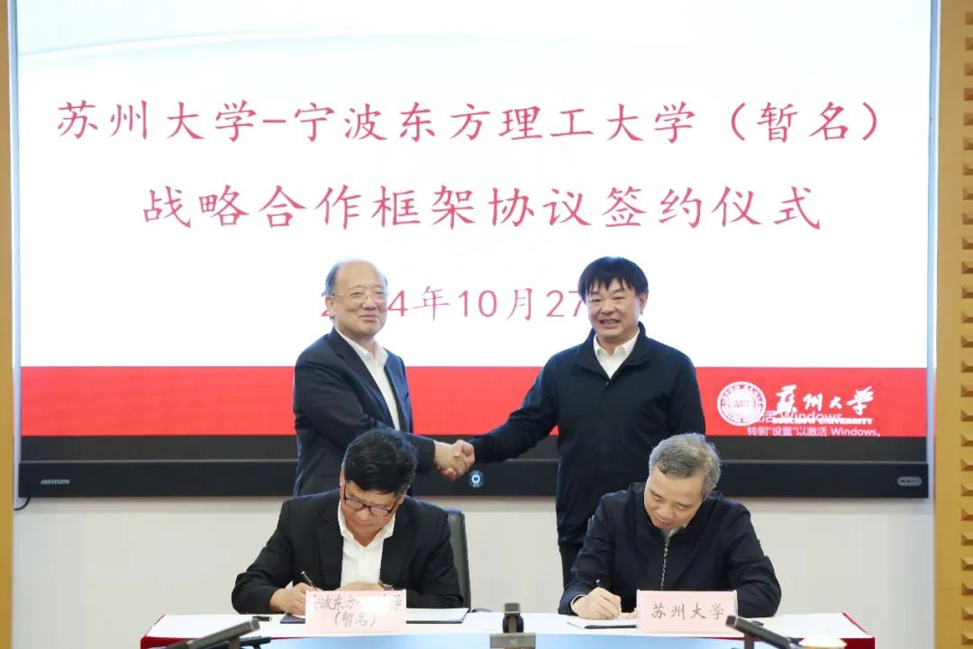 10月27日,宁波东方理工大学(暂名)与苏州大学战略合作框架协议签订仪式在苏州大学天赐庄校区举行,双方将在科研合作、师资队伍建设、学生交流、博士生联合培养等方面推动合作,服务国家战略,助力创新驱动发展。中国科学院院士、我校校长陈十一,中国工程院院士、苏州大学校长应汉杰出席仪式并讲话,宁波东方理工大学(暂名)副校长郑春苗与苏州大学副校长沈明荣代表双方签约。苏州大学副校长姚建林出席此次签约仪式。