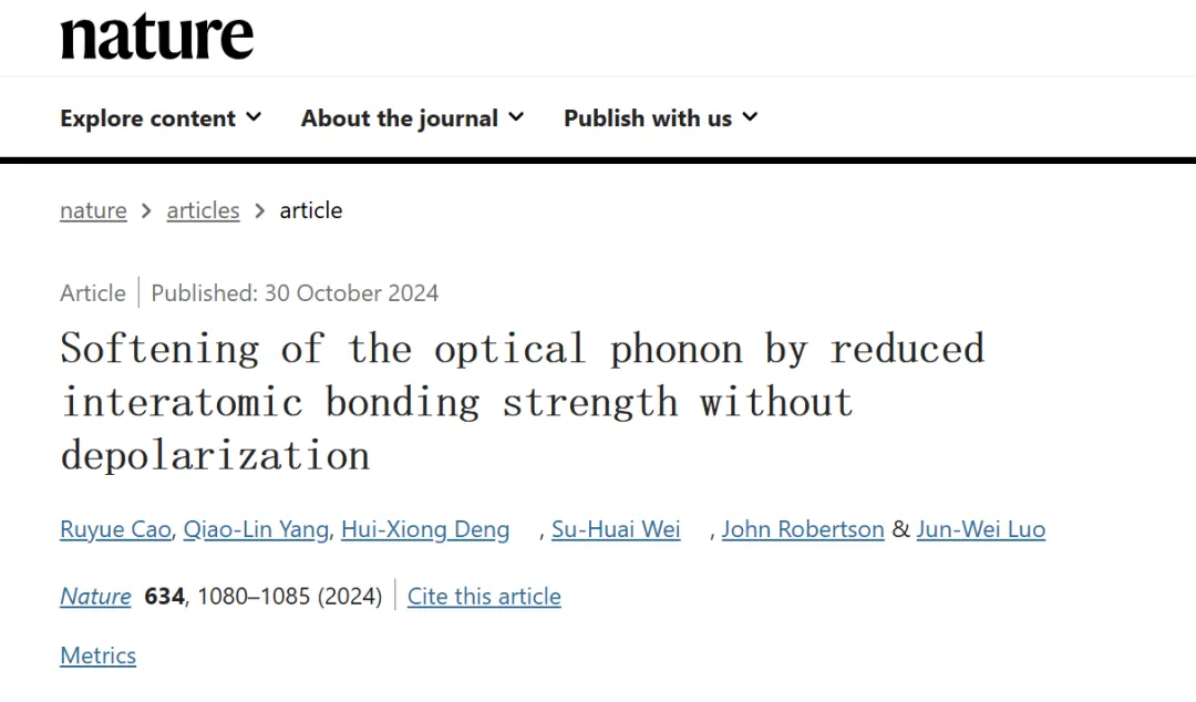 10月30日,宁波东方理工大学(暂名)物理学院院长、讲席教授魏苏淮,联合中国科学院半导体研究所骆军委研究员、邓惠雄研究员研究组,以“通过降低原子化学键强度诱导的光学声子软化避免退极化效应(softening of the optical phonon by reduced interatomic bonding strength without depolarization)”为题的论文,发表在《nature》杂志。