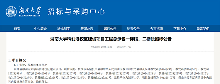 10月30日,湖南大学发布科创港校区建设项目工程总承包一标段、二标段招标公告,公告显示,项目总投资为501220万元,建设地点位于湖南省长沙市湘江新区湘江科学城,用地总面积为1166.18亩。项目工期要求为555天,将在2026年6月30日前完成竣工验收。