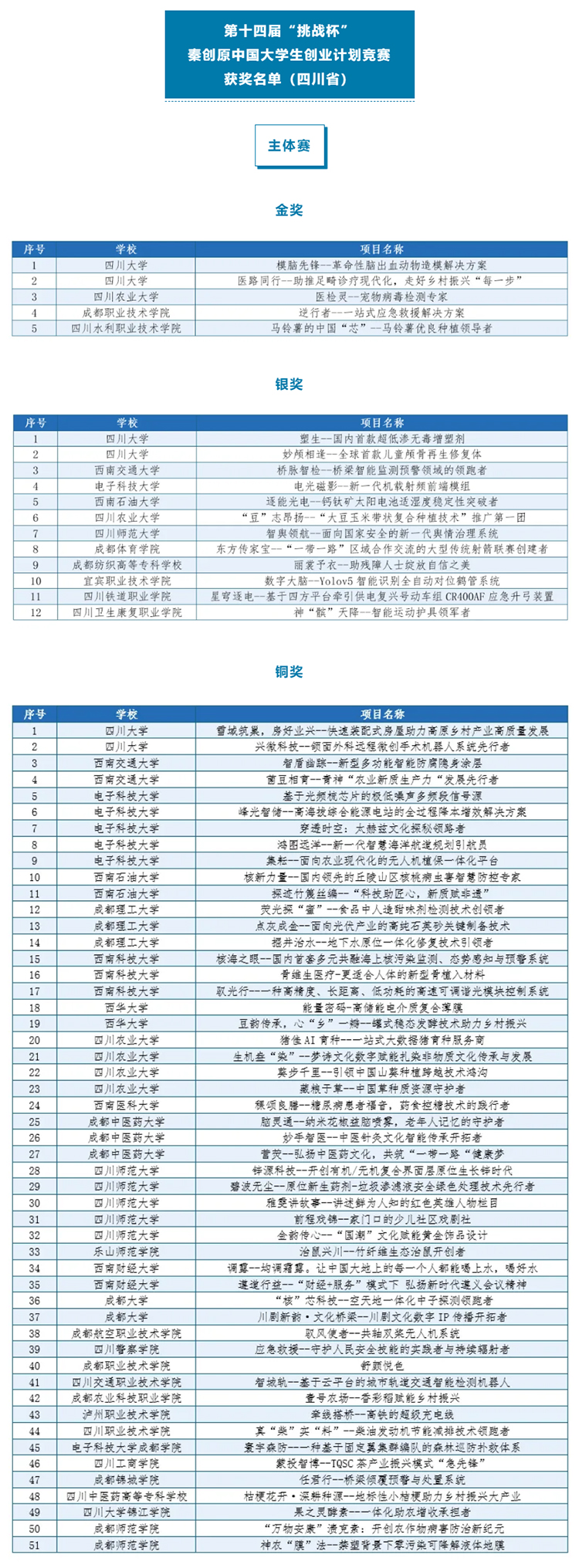 第十四届“挑战杯”秦创原中国大学生创业计划竞赛获奖名单(四川省)