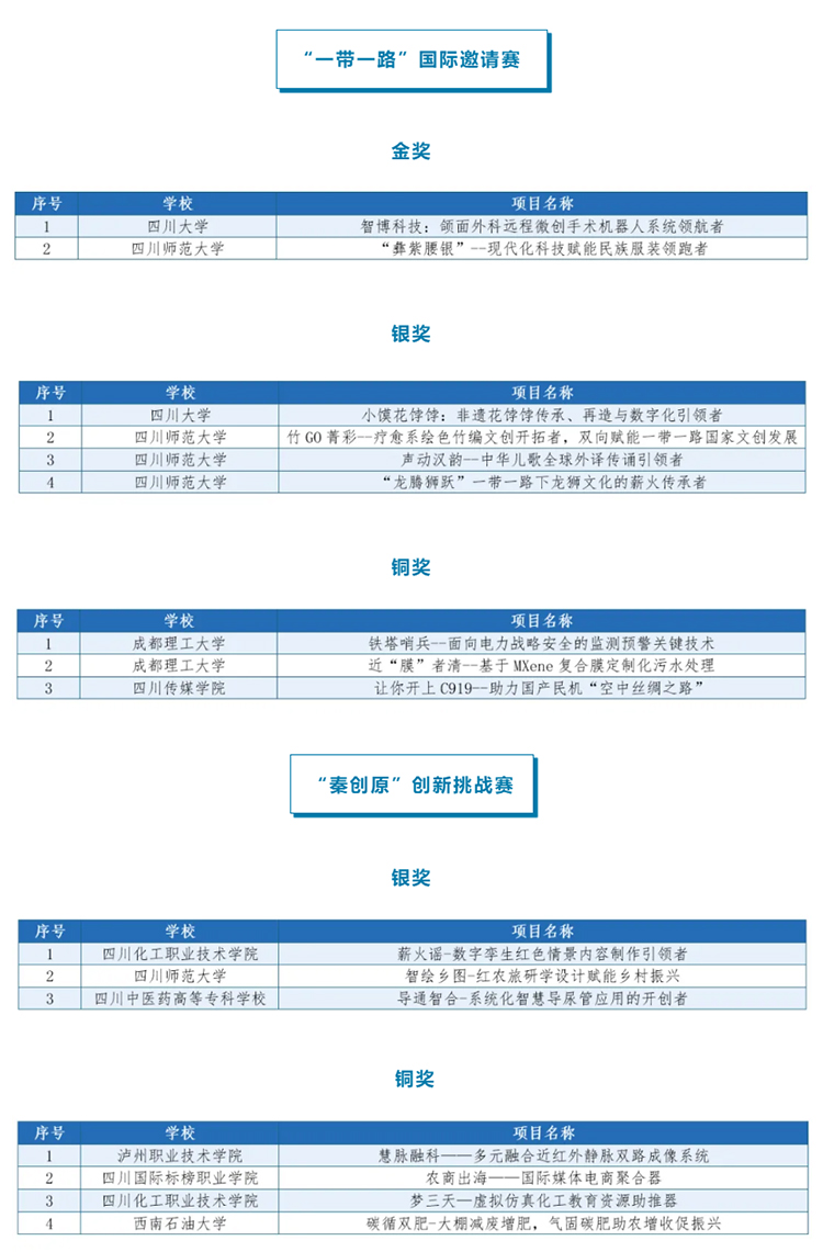 在国赛主体赛中,四川省高校斩获金奖5个、银奖12个、铜奖51个。在专项赛中,四川省也取得了优异成绩,其中“一带一路”国际邀请赛获金奖2个、银奖4个、铜奖3个,“秦创原”创新挑战赛获银奖3个、铜奖4个。