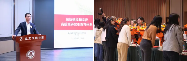 龚旗煌向研究生院成立40周年表示祝贺,向所有为研究生院的建设与发展作出贡献的老领导、老同事和全体教职员工致以诚挚感谢,并充分肯定了研究生院与全校各部门单位、全体导师和研究生共同努力,培养高层次拔尖创新人才,服务学校“双一流”建设大局所取得的显著成效。他总结了北大研究生教育在招生制度、培养体系、导师队伍、资助体系、开放办学等方面推出的一系列前瞻性、引领性改革创新措施,并强调,要进一步贯彻党的二十届三中全会深化教育综合改革的战略部署,落实习近平总书记在全国教育大会上发表的关于“一体推进教育发展、科技创新、人才培养”的重要讲话精神。他号召研究生院赓续光荣传统、紧抓历史机遇、深化改革创新,在立德树人、服务需求、质量提升、协同育人等方面继续开拓进取,为强国建设提供高层次人才的坚实支撑。
