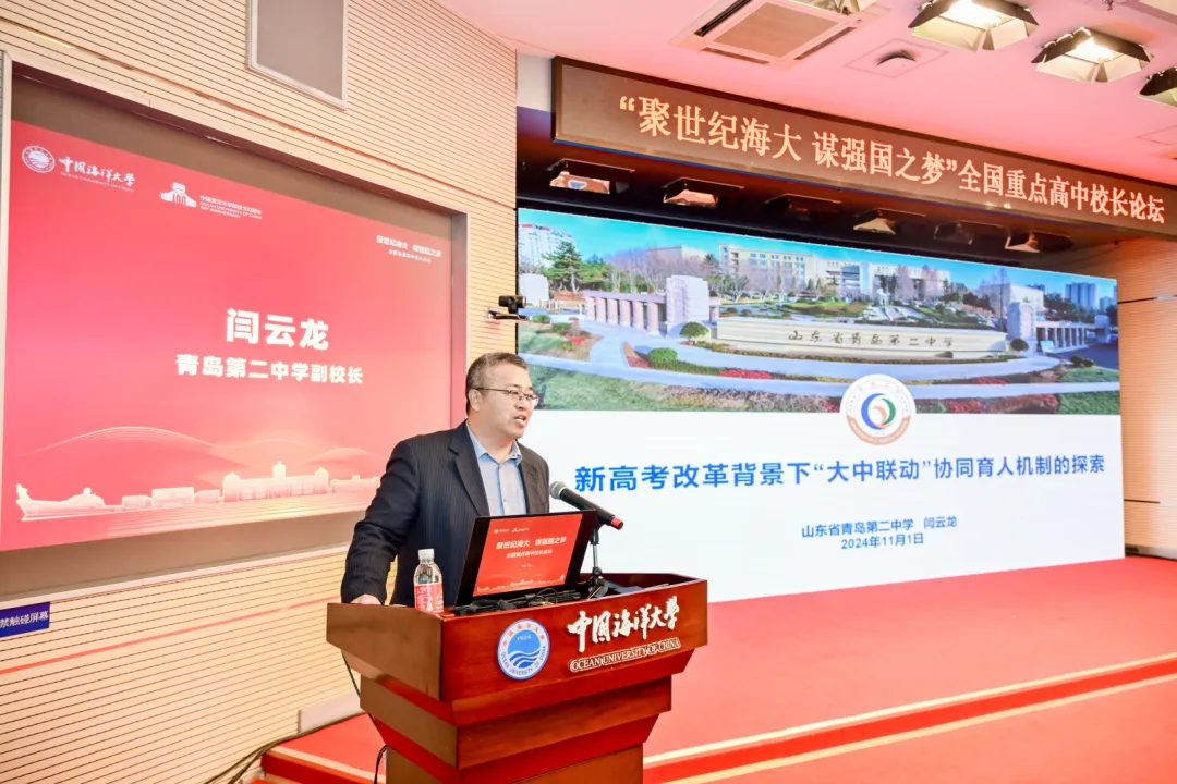 10月31日至11月2日,中国海洋大学2024年全国重点高中校长论坛在崂山校区举行。本次论坛以“聚世纪海大,谋强国之梦”为主题,深入学习宣传贯彻习近平总书记给中国海洋大学全体师生重要回信精神,汇聚了全国百余所重点中学的校长及教育教学负责人、教育领域知名专家,聚焦优秀海洋人才培养新范式,探讨拔尖创新人才自主培养新路径,共商高等教育、基础教育“双高融合”育人新举措。中国海洋大学党委常委、副校长刘勇出席论坛并致辞。