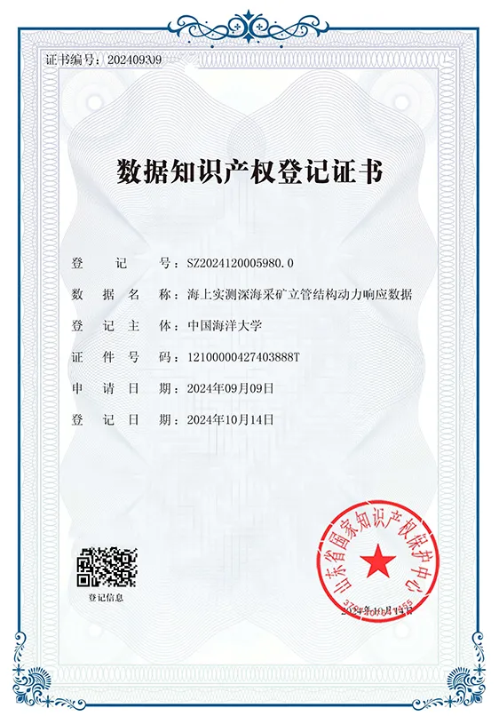近日,中国海洋大学获得了由山东省国家知识产权保护中心颁发的数据知识产权登记证书。数据名称为“海上实测深海采矿立管结构动力响应数据”,这是该校首个也是山东高校首个数据知识产权证书。
