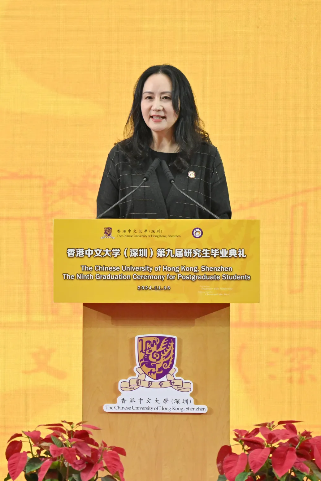 11月16日上午,香港中文大学(深圳)第九届研究生毕业典礼在大学礼文堂举行,1500余名研究生即将告别神仙湖畔的学术殿堂,走向社会书写青春与梦想新的华章。在毕业典礼上,华为公司孟晚舟女士作为特邀嘉宾发表了精彩演讲。