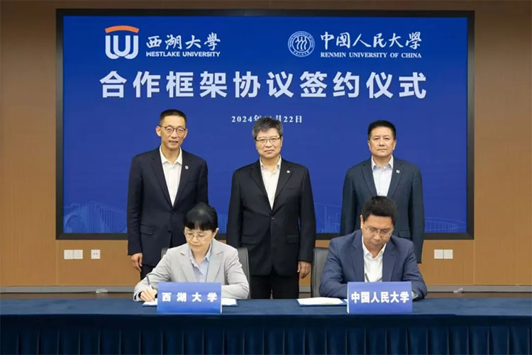 11月22日,中国人民大学与西湖大学合作框架协议签约仪式举行。双方将本着“优势互补、资源共享、合作共赢”的原则,在未来前沿领域研究、人才联合培养、师资队伍建设、学术交流等方面建立长效合作机制,为服务教育强国建设和中国式现代化贡献力量。
