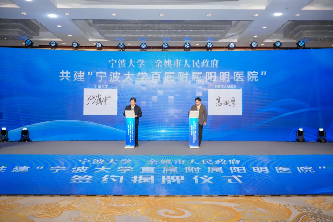 张真柱与高海军签署共建协议。余姚市人民医院正式成为宁波大学直属附属医院。即日起,余姚市人民医院冠名为宁波大学附属阳明医院,余姚市人民医院作为第二名称保留。