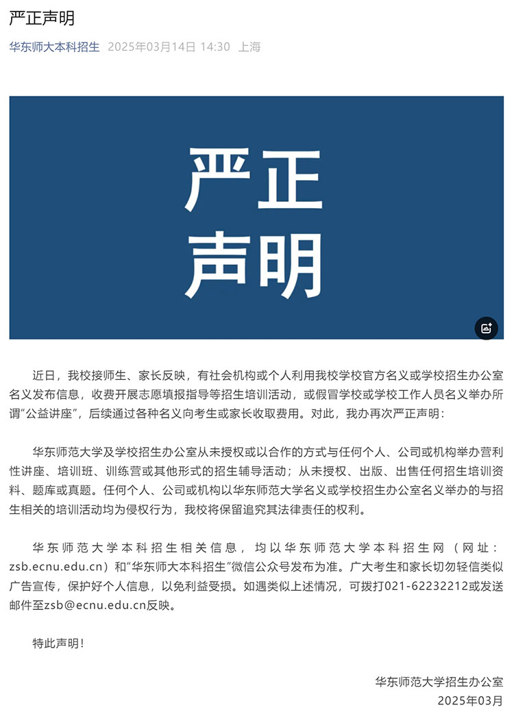 3月14日,华东师范大学招生办公室发布《严正声明》称,华东师范大学及学校招生办公室从未授权或以合作的方式与任何个人、公司或机构举办营利性讲座、培训班、训练营或其他形式的招生辅导活动;从未授权、出版、出售任何招生培训资料、题库或真题。